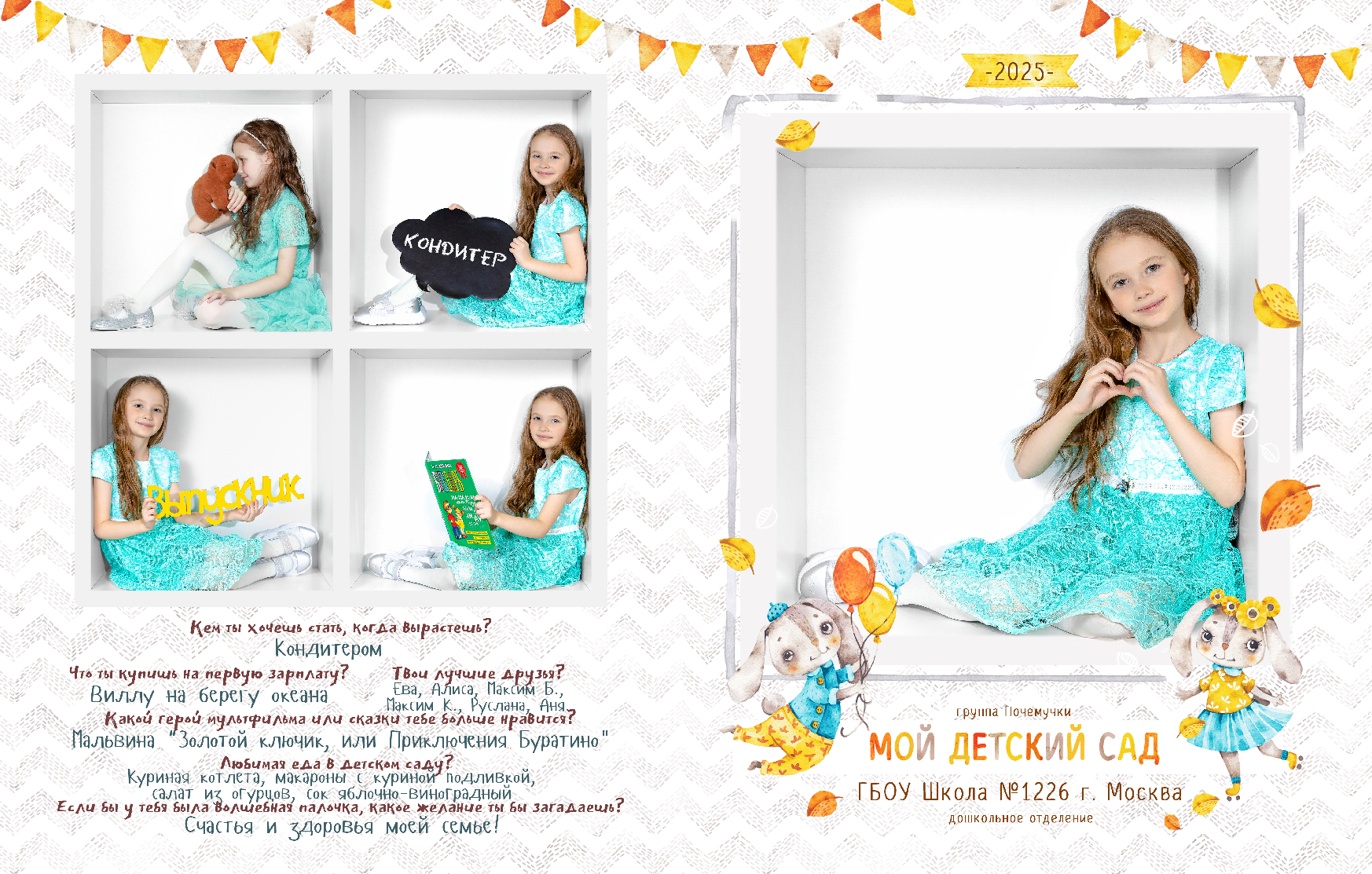 Примеры разворотов, если помимо фотосессии в кубиках, проводилась фотосессия в группе или на фотофоне.